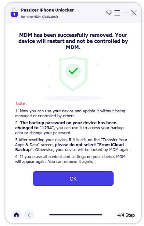 3. Su contraseña de copia de seguridad de iTunes se cambiará a “1234” y podrá modificar la contraseña posteriormente.