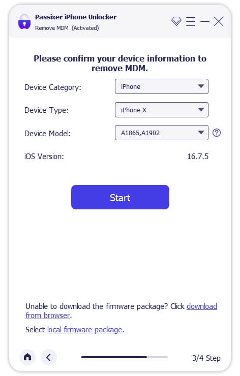 Configure la información del dispositivo para el iPhone/iPad conectado y haga clic en Comenzar para descargar el archivo de firmware relacionado.