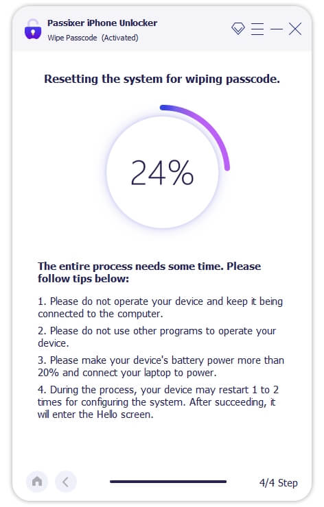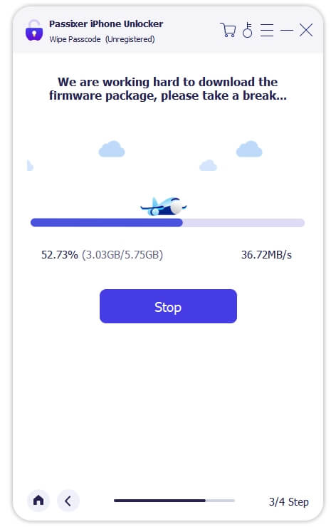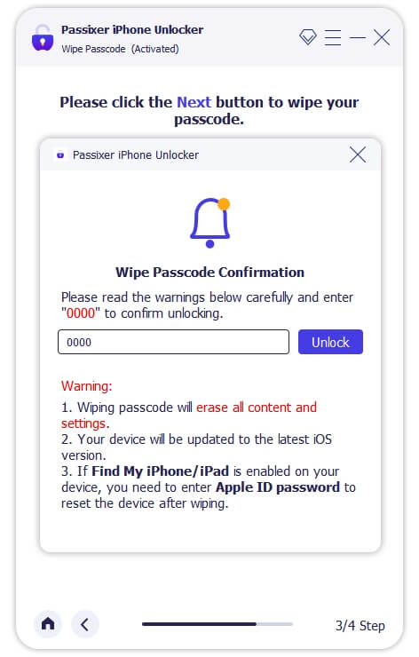 Confirma tu operación de desbloqueo ingresando 0000 en el campo y luego pulsa el botón Desbloquear. Inmediatamente, Passixer comenzará a desbloquear el código de iPhone/iPad olvidado para ti. Por favor, mantén tu iOS dispositivo conectado durante el proceso de desbloqueo.